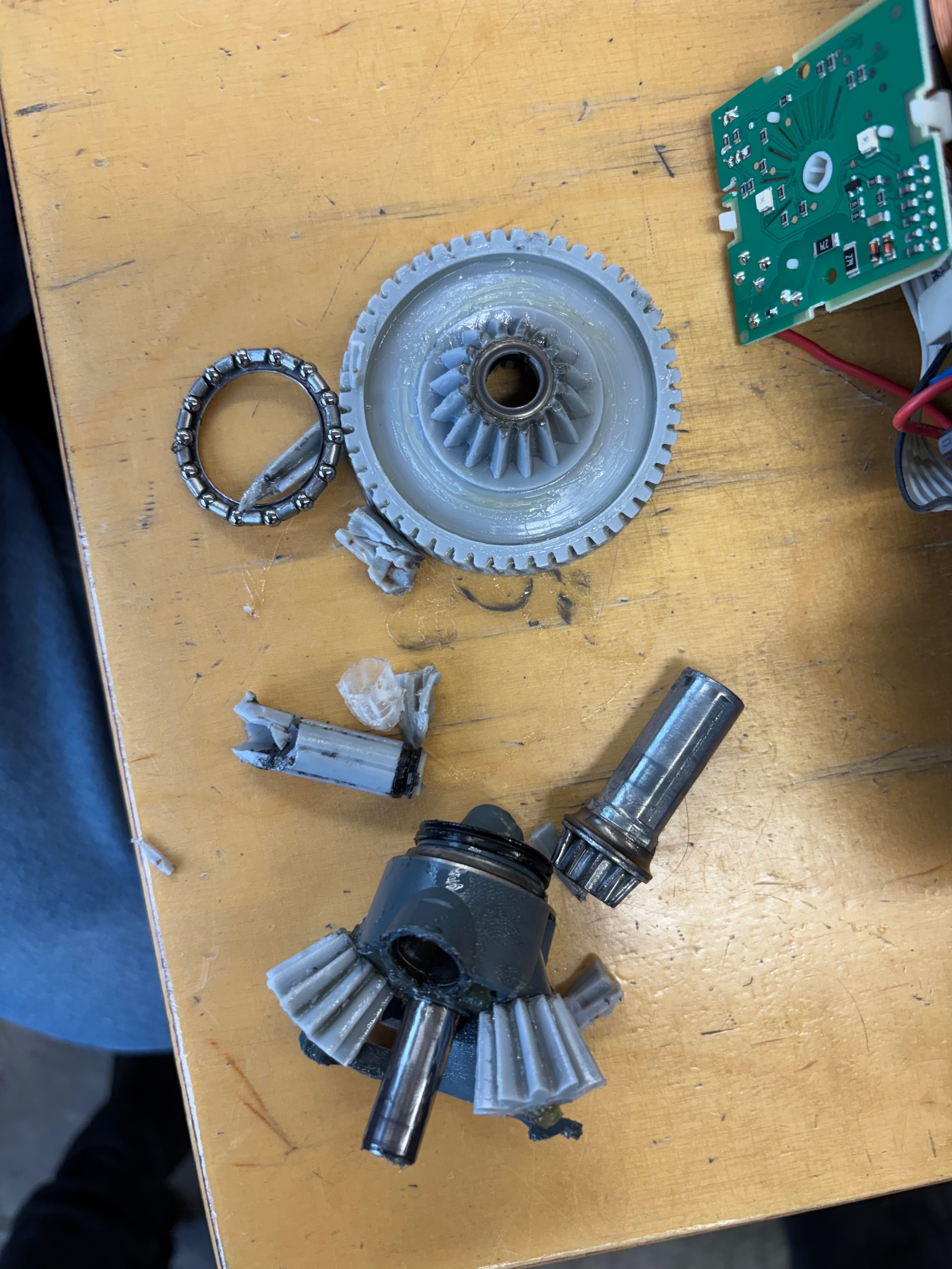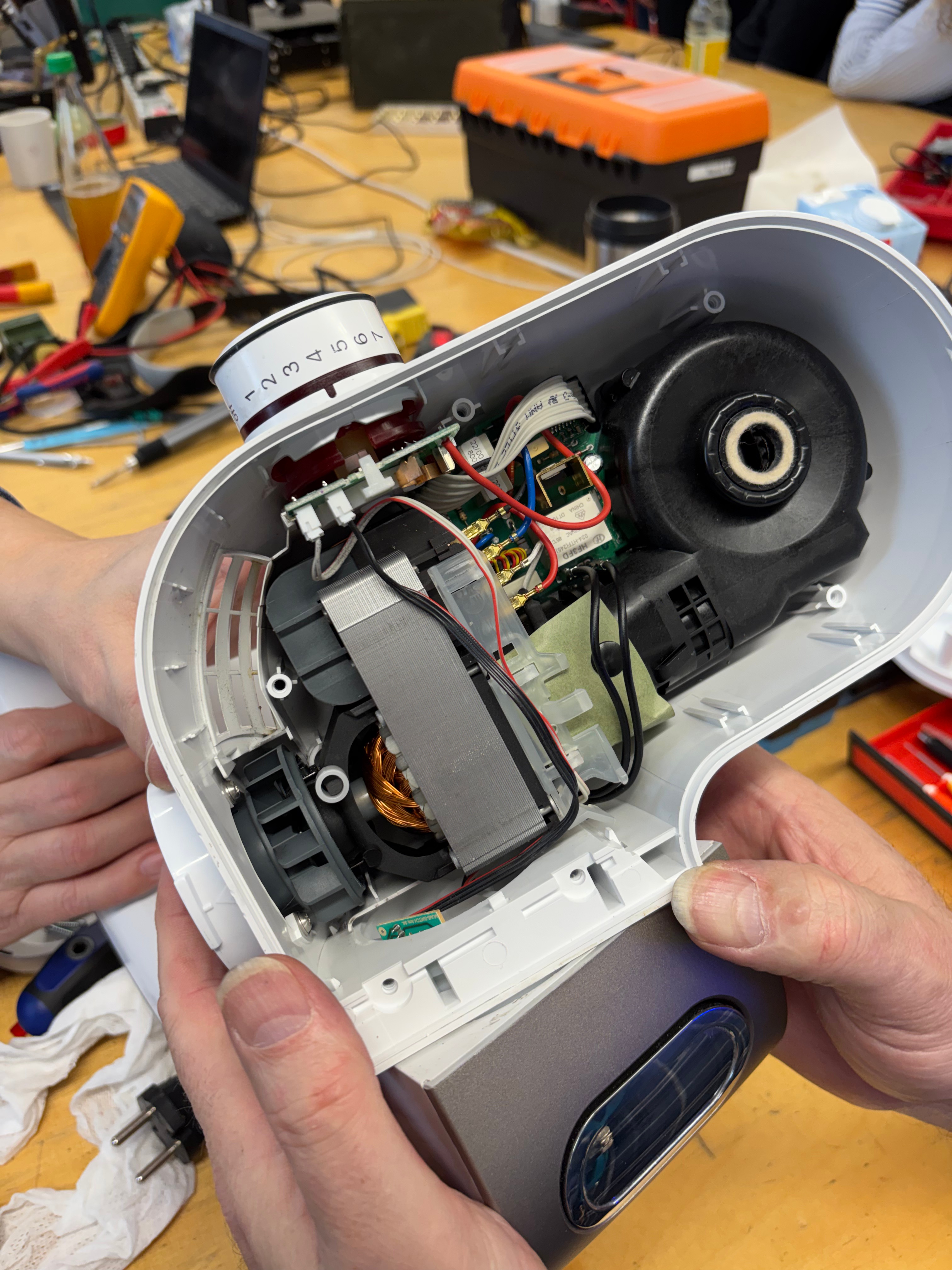 Ein großer Raum voller Tische, Gerätschaften und Technik und vor allem technisch begabter Menschen, die nur darauf warteten, Probleme zu lösen. Am liebsten gemeinsam mit den Bittstellern, so sie denn über einen Funken technische Begabung verfügen. Auf meinen Sohn trifft dies glücklicherweise zu. Am Eingang begrüßte uns ein Herr an einer Tafel, auf der geflissentlich notiert wurde, welche Geräte zur Bearbeitung gebracht wurden. Während sich zeitweise bis zu fünf Tüftler mit meinem Sohn zwei Stunden lang um den Ofen bemühten, den wir letztendendes guten Gewissens entsorgen konnten, weil sich seine Probleme als zu komplex herausstellten, hatten meine Küchenmaschine und ich es mit zwei Spezialisten zu tun. Sie schraubten auf, zeigten mir alles, ich fotografierte und dokumentierte, damit wir im Anschluss die passenden Ersatzteile bestellen konnten. Die Herren waren der Meinung, dass wir mit Hilfe eines YouTube Videos und der fachkundigen Expertise den Einbau dann zuhause selbst bewerkstelligen könnten. Puh.